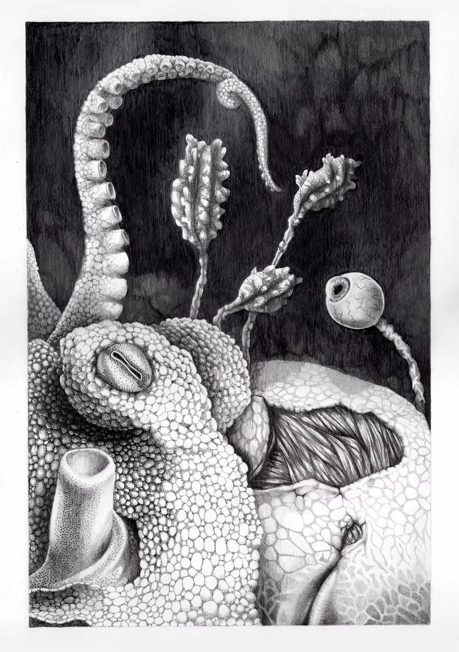 The Ocular Superiority of Cephalopods (2019) sees octopus and human quite literally meet eye-to-eye. The two figures appear to be wrestling for space on the page but also in quiet observation of each other. EchinodermDentata(2019) describes a similar hybrid, where animal meets human.