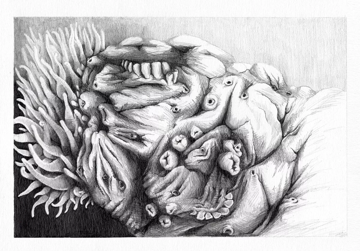 Erin Coates was born and raised in Albany, a coastal city on the southern tip of Western Australia. Her fascination with the ocean is partly inherited as her father was a professional shell diver; she grew up in a house full of shells, marine curios and relics from shipwrecks. An avid snorkeler and free-diver herself, the variety of marine life in her graphite drawings comes from first-hand observation. Across the series we see a menagerie of molluscs, sponges, weeds and corals in combination with parts of the human body.