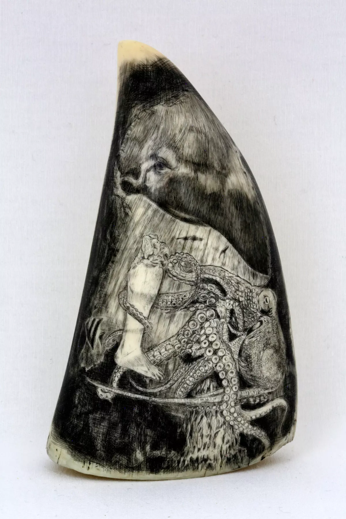 In 2015, Anna Nazzari produced a series of carvings using the late-eighteenth century technique of scrimshaw. The hand-skill involves engraving the surface of whales teeth and bones. As a relic of the whaling industry, the teeth are frequently dominated by heroic imagery chronicling dangerous sea journeys; coastlines and landscapes recorded from sea; and feature portraits of boats, sailors or important naval figures. A scrimshander, the title given to a person who produces scrimshaw, would often rub the carving with soot to make visible the etched surface.