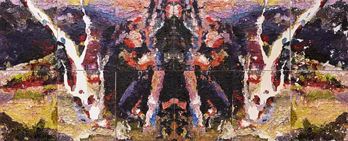 The inspiration for Ben Quilty’s monumental Rorschach painting is an Australian scene painted in Europe 140 years ago by H.J. Johnstone, Evening shadows, backwater of the Murray, South Australia. Read simply, the original painting depicts a tranquil scene at the end of the day: a Ngarrindjeri family camping at a scenic river bend along the River Murray prepare for the evening. Another possible reading sees the painting as a nineteenth- century allegorical meditation on the perceived decline and disappearance of Aboriginal people.