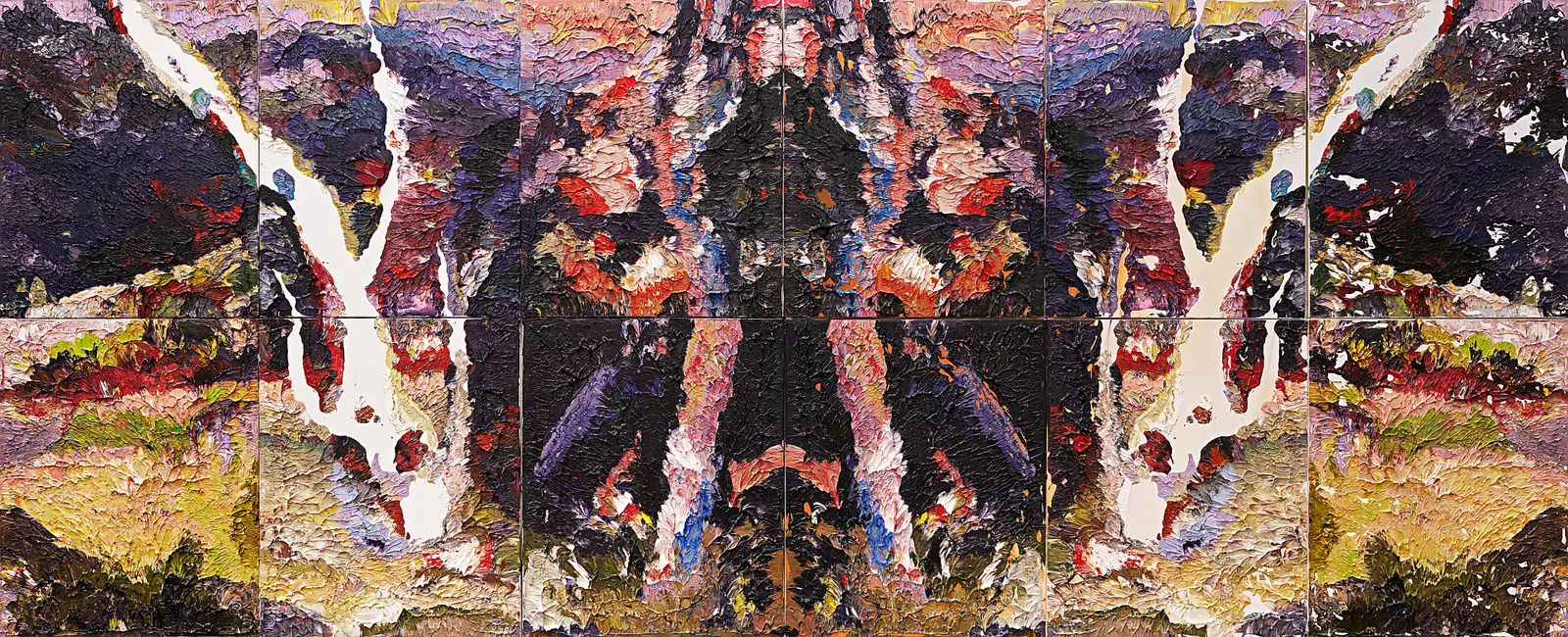 Quilty’s eight-panel painting Evening shadows, Rorschach after Johnstone remakes the original painting to comment on Australia’s history. Inspired by Hermann Rorschach’s eponymous ink blots – an early twentieth-century psychological- testing tool – Quilty loads the canvas with impasto oil paint, only to destroy the surface by pressing a second unpainted canvas directly onto the first. Chance intervenes by creating accidents and abstractions that invite us to reflect on our own perceptions, desires and experiences.