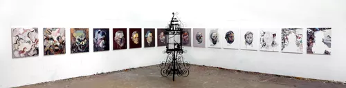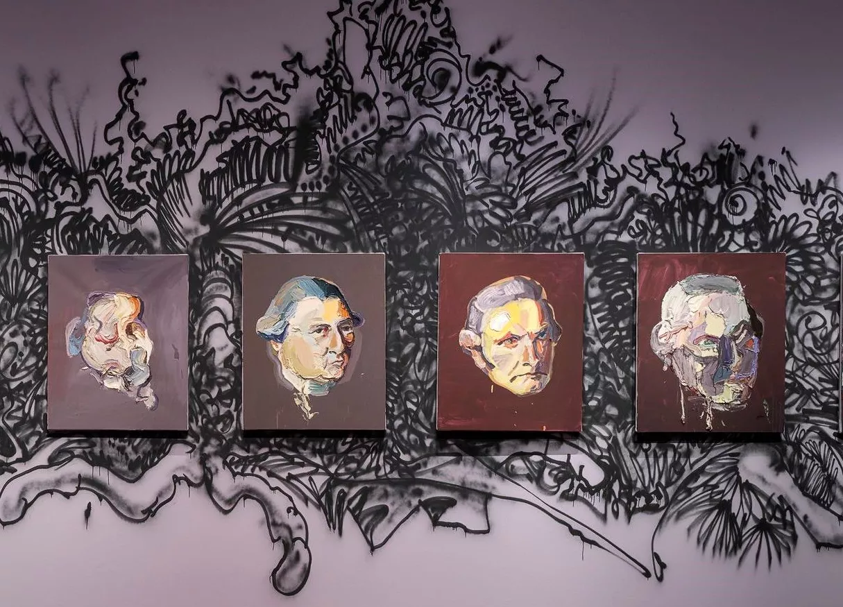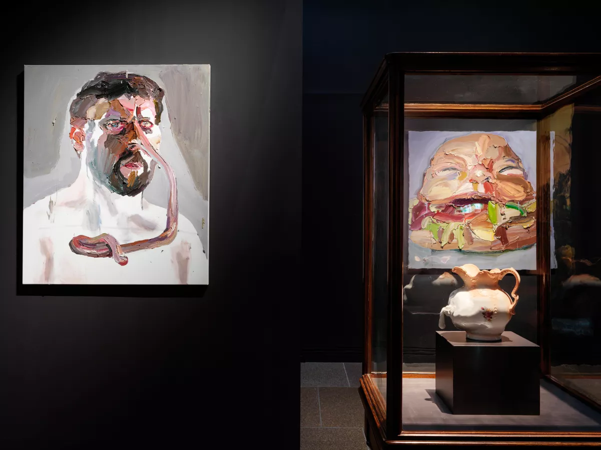 Installation view: Quilty featuring Straight white male, nose self portrait, Joe Burger and Jug (Nose) by Ben Quilty, Art Gallery of South Australia, Adelaide, 2019; photo: Grant Hancock.