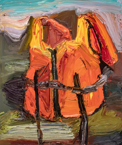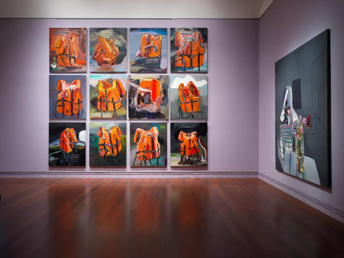 In 2016 Ben Quilty travelled to Europe and the Middle East with writer Richard Flanagan, where they witnessed first-hand the refugee crisis. Quilty and Flanagan met families who had lost family members including children who had attempted the journey across the Aegean Sea. The life jacket, known for its ability to save lives has been used by Quilty in many ways to draw attention to the lives lost of those seeking refuge.