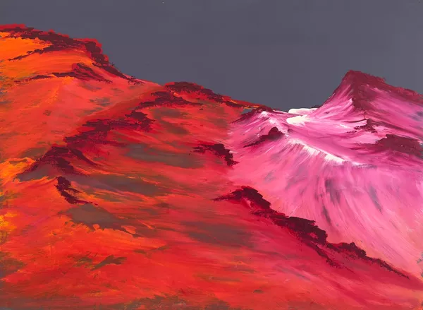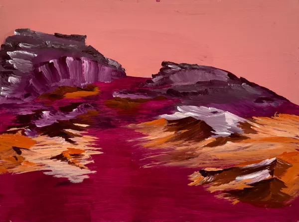 The colour and scenery change as you move along the road. Although it looks pink, it’s reddish and has stand-out whites, yellows and purples and some areas where it’s almost black. During sunrise and sunset, the colours change, and I try to capture all these qualities and transformations in my paintings.[3]