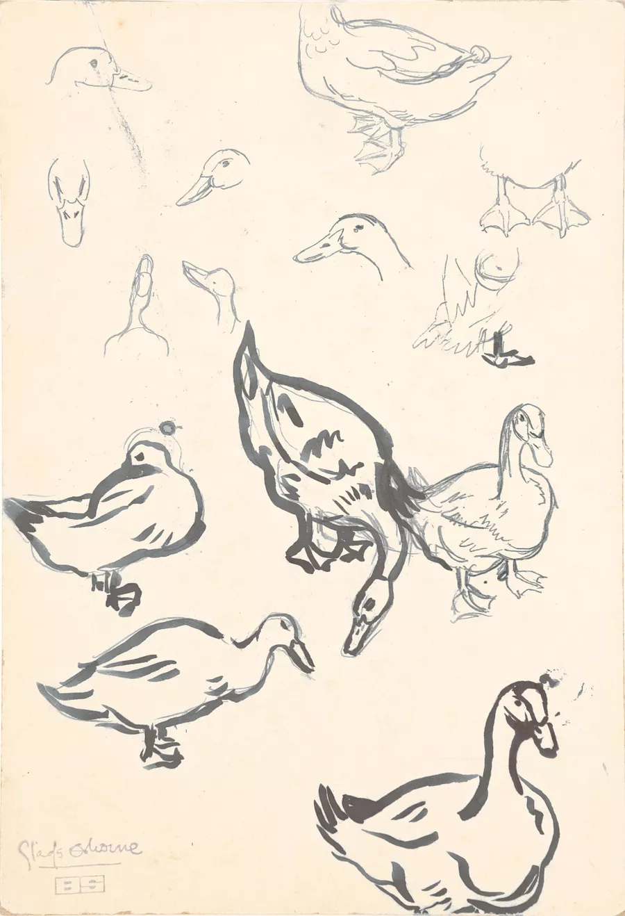 Gladys Reynell, born Glenelg, South Australia 4 September 1881, died Melbourne 16 November 1956, Studies of geese, 1919-26, Reynella, South Australia, ink & pencil on card, 23.2 x 15.9 cm (sheet); Ellen Christensen Bequest Fund 2004, Art Gallery of South Australia, Adelaide, © estate of Gladys Reynell.