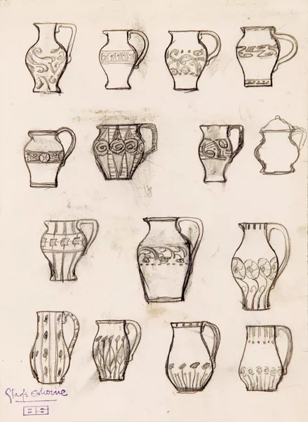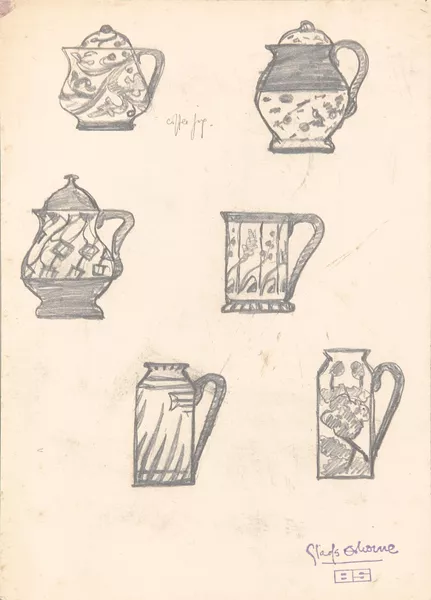 Look at Reynell’s experimental sketches. Using coloured paper, cut out geometric and organic shapes. Use these to experiment with pattern, colour and shape to create a design for a functional object such as a tea-pot, vessel or even fabric and wallpaper.