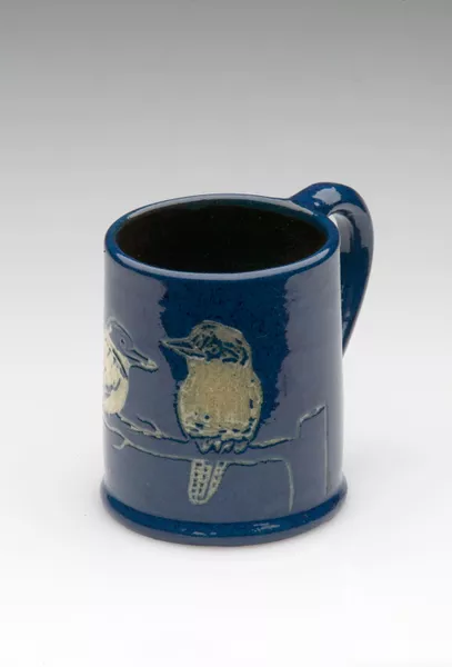 Emu beaker shares a tradition with the ceramics produced by the Omega Workshops in London (1913-19). Under the direction of Roger Fry, the style promoted was one of handmade simple forms, allowing the visibility of the maker’s hand. Here, the sgraffito technique – scratching an image through a coloured slip to reveal the body of the pot beneath – is used to bold effect. In place of scenes or designs based on English life and flora, Reynell has etched the iconic silhouette of the emu, a distinctly Australian image. Sgraffito was also an extension of her skills in printmaking whilst designing in the round in a strong graphic manner. Here simplified form, repeated rhythmic patterns and colour contrasts and harmonies were privileged over representational imagery.
