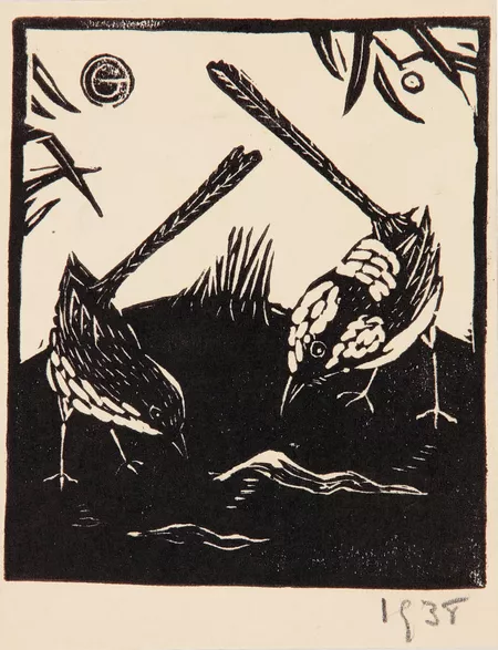 Gladys Reynell, born Glenelg, South Australia 4 September 1881, died Melbourne 16 November 1956, Platypuses, c.1934-38, Curdie Vale, Victoria, linocut printed in black on brown paper, 11.9 x 9.9 cm; South Australian Government Grant 1969, Art Gallery of South Australia, Adelaide, © estate of Gladys Reynell.
