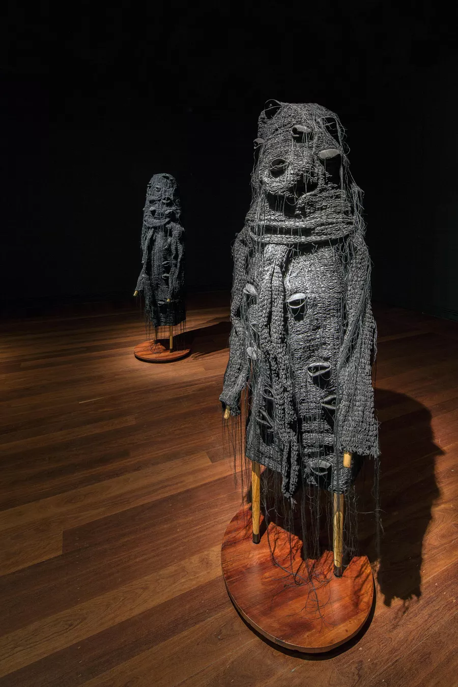 Heather B Swann, born Hobart 1961, Banksia Men, 2015, Canberra, wood, metal, silk, glass, 9 parts, Music score: Thomas Green (composition and production); Kevin Brophy (poetry); Jack Swann (voice); James Nightingale and Martin Kaye (saxophone), 230.0 x 75.0 x 75.0 cm (each); Dr Christine Annette Lunam Bequest through the Art Gallery of South Australia Foundation 2016, Art Gallery of South Australia, Adelaide, © the artist.
