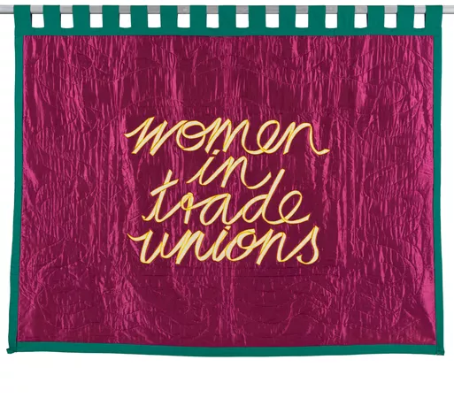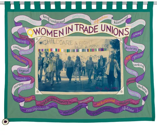 The Women in Trade Unions banner, was made between 1985 and 1987 and was designed by the South Australian artists Elaine Gardner and Kay Lawrence for the South Australian Women in Trade Unions Network.[ 1] Made in white, green and purple, the colours of the WSPU, the banner has as its centrepiece a cyanotype – a type of photographic image – and shows women marching with a banner bearing the text ‘CHILDCARE A RIGHT NOT A PRIVILEGE’. The image, from a photograph taken during a May Day parade in 1986, is surrounded by swirling lavender ribbons. Interestingly, the artists substituted the wording on the original banner – WOMEN IN TRADES UNIONS – with the text demanding childcare. Directly above the image in this banner’s text is the original text, depicted in swirling embroidery. The labour historian Kathie Muir notes about this banner that, ‘the words also differ from the traditional banner content in that they appear in seven different languages (in the ribbons around the edge of the banner) and express the things that women do together as part of their organising for change’.[2] The banner is augmented with several subtle decorative devices, including embroidery on the dress of the figures at the centre and around the edge, details reflecting the often-invisible nature of work performed by women, while also linking back to the traditions of women’s needlework.