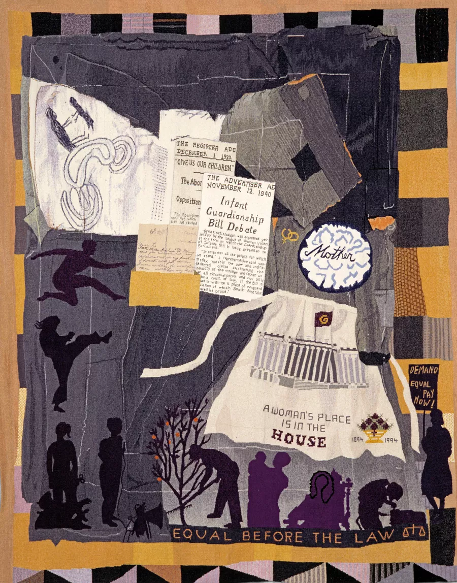 Votes for Women appropriates the Greek pillar and gold frame typical of portraits in the Chamber, but rather than focusing on one man, depicts three suffragists, Catherine Helen Spence, Mary Lee and Elizabeth Webb Nichols, above an image of the great petition of more than 11,000 signatures that informed the South Australian Parliament of the ‘absolute justice of giving women the franchise for both Houses of Parliament on the same terms as ... men’. The frame, cut to reveal a coiled Ngarrindjeri mat, suggests that the State of South Australia was itself imposed on unceded Aboriginal land. Facing off on the other side of the Chamber hangs Equal Before the Law. This less-orthodox tapestry presents a heterogeneous collection of images, pieced together like a patchwork quilt. The images refer to a raft of legislation passed by the South Australian Parliament in the twentieth century outlawing discrimination on the grounds of sex and marital status and giving women rights over their bodies and their children.