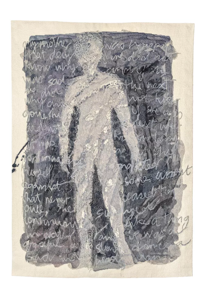 In the 1990s, developed a particular interest in mother/daughter relationships. The figure in Daughter is based on a photograph taken by Lawrence of her daughter Ellie. In the tapestry this image, after being adapted into a drawing, is transformed into a much more general figure, which looms life-size through a background of text. The text is not especially easy to read and forms as much as a pattern as providing verbal clues to the work. The text is from the novel Housekeeping by Marilynne Robinson and reads as follows: