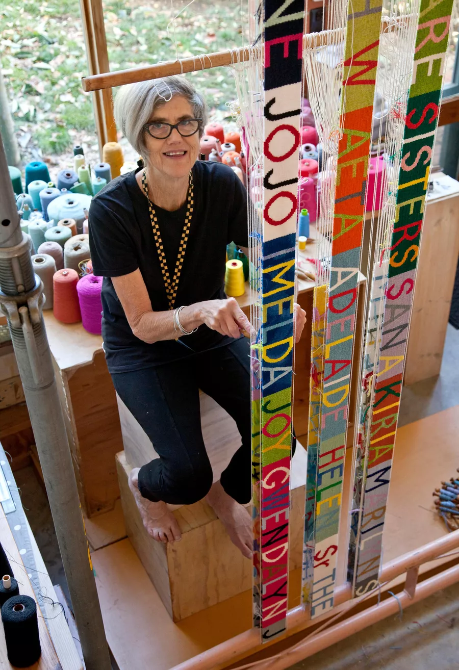 Lawrence’s practice in tapestry, on Peramangk land in the Adelaide Hills, has focused on concepts of feminism and materiality for several decades. Key tapestries include, Daughter, 1995–96, and Rant, 2002, 2009, and 2017 and the Women’s Suffrage Centenary Community Tapestries, 1993, for the South Australian Parliament, and the Women in Trade Unions banner with artist Elaine Gardner, 1985–87, for which Lawrence was both designer and contributor. The Women’s Suffrage Centenary Community Tapestries and Women in Trade Unions banner are on loan from the Parliament of South Australia and The Working Womens Centre, SA Collection, respectively.