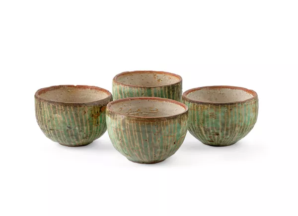 The ceramics Moon created after he had returned to Australia reveal the influence of prominent styles of pottery in Japan, including the use of the distinctive green colour associated with Oribe ware, a style of Japanese ceramics that dates back to the sixteenth century. The dimensions and shape of Moon’s Small bowl with green dripped glaze, 1970, approximate the bowls (chawan) utilised for the ritual of tea in Japan. The Oribe style bowl reveals the raw clay, which contrasts with the striking veins of green glaze.