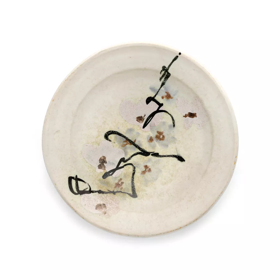 These dishes, bowls and plates created by Moon in the late 1970s and early 1980s display a distinct series of brush marks that represent plum blossoms blowing in the wind. Others like Dish, 1982, reveal the influence of calligraphy. Moon studied the Japanese language prior to his residence in Japan; however, the calligraphy on the dish is not legible and instead has become a design possibly inspired by the small, colourful strips of paper hung on trees during the Tanabata festival, known as tanzaku.