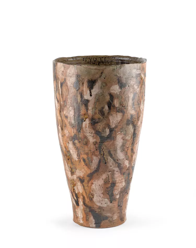 Milton Moon, born Melbourne 1926, died Adelaide 2019, Floor pot, from the Brachina series, 1997, Beulah Park, South Australia, stoneware, 75.0 x 42.0 cm (diam.); Gift of Milton and Bette Moon 2000, Art Gallery of South Australia, Adelaide, © Estate of Milton Moon.