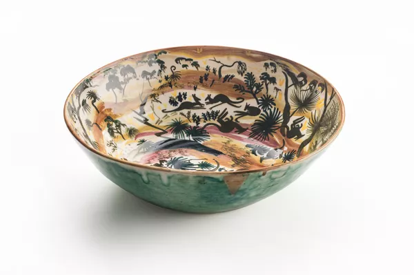 Moon was influenced by a diverse range of artists and traditions at the beginning of his career in ceramics including artists David Boyd (1924–2011) and Hermia Boyd (1931–2000), who had established their own ceramics range called Hermia Ware. David was the son of Merric Boyd (1888–1959), regarded as the ‘father of Australian studio ceramics’. Both Merric and David, and other members of the Boyd family, drew heavily on folk traditions, figurative forms and applied decoration in their ceramics, made initially at Murrumbeena in Victoria.