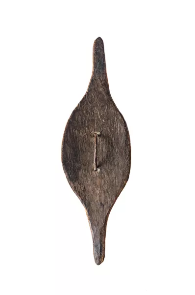 The Murlapaka, one of two types of shield made by the Kaurna people, is made from the inner bark of a eucalyptus tree and is characterised by its oval shape with elongated tapering tips. Three incised parallel lines, in opposed arc patterns, run longitudinally on each side, while towards the ends of the shield are shorter configurations with two correlating lines. Evident over the markings are the remnants of earth pigments, suggesting that the shield’s maker once applied red ochre and white clay over the surface. A handle has been pushed through two holes in the centre of the shield, possibly when the bark was still fresh and malleable.