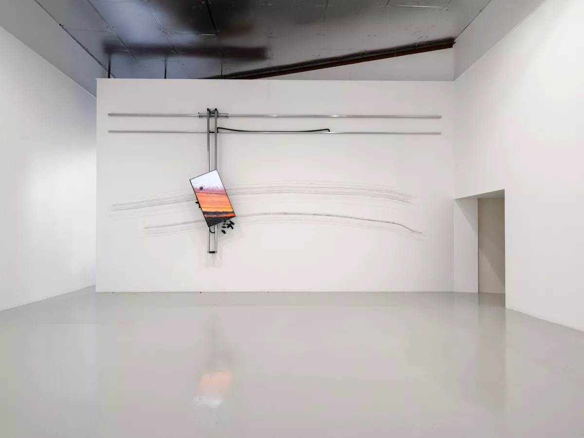 Robert Andrew, Yawuru people, Western Australia, New eyes – old Country – Nagula, 2025, charcoal, electromechanical devices, aluminium components, single channel video, dimensions variable; Image courtesy the artist and Milani Gallery; photo: Carl War; photo: Carl D Warnerrr.