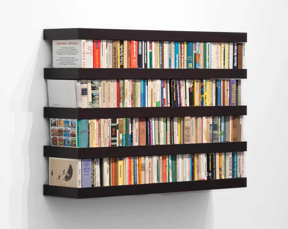 Reference (Lack), 2007 belongs to a series that explores the concept of the human everyday experience and addresses the small things we do to make ourselves feel at home. This work was created in Berlin in 2007 and is comprised of mass produced flat-packed IKEA bookshelves called Lack and 252 second hand reference books. The juxtaposition of different sources of materials also highlights the global need to balance cheap production costs, the non-sustainable use of natural resources, the oversupply of commodities and guaranteed employment.