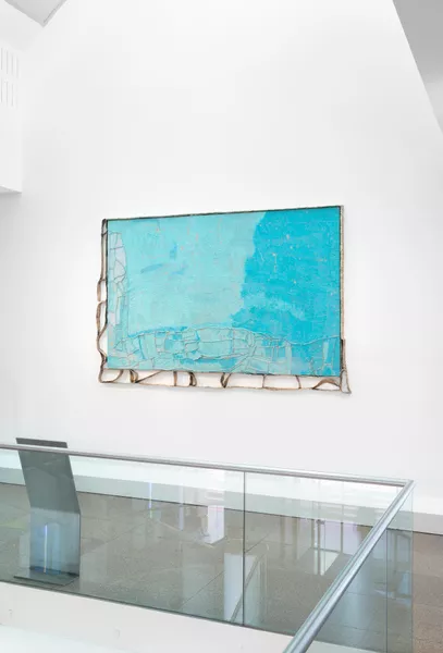 The urge to document underpins George’s longstanding interest in material archives and collections, and how objects might ‘hold and communicate stories and ideas—like portals.’6 In Sky piece, falling (Melbourne, Perth) (2020–21), George has created a bronze scaffold to support a fallen sky, both objects replete with the idiosyncratic impressions and traces of the artists hand. The bronze object doubles as a prop and a frame; like a landscape painting, it offers a window onto the world. Across the Sky Piece series we observe George’s pursuit of the portal, her works acting as material threshold between us and an immaterial place.