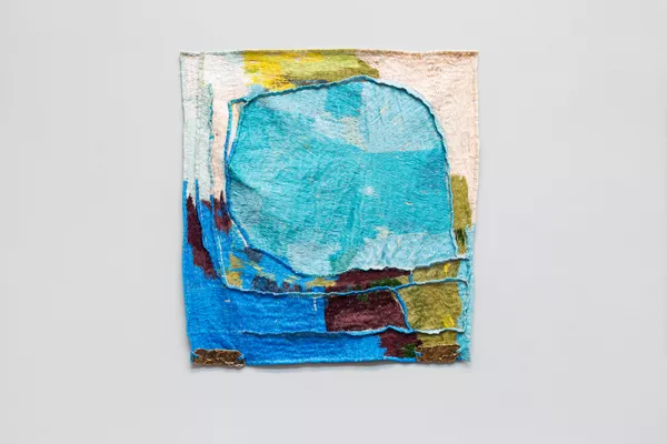 Each work in the Sky Piece series is titled according to the places in which they were made, such as Sky Piece (Melbourne, Barcelona, Madrid, Leon, Gijon, Palermo, Koh Samui) (2023) or Sky Piece (Cottesloe) (2020); ‘I collect threads wherever I am in the world and it becomes routine—part of walking through a city.’1 While we might read such works as two dimensional images–a form of landscape painting, a skyscape or upward-looking vista–George is most interested in the sky as an abstract, non-representational, poetic force. Her objects compress time, sometimes years, with geography; they capture an atmosphere of place.2