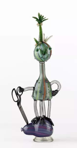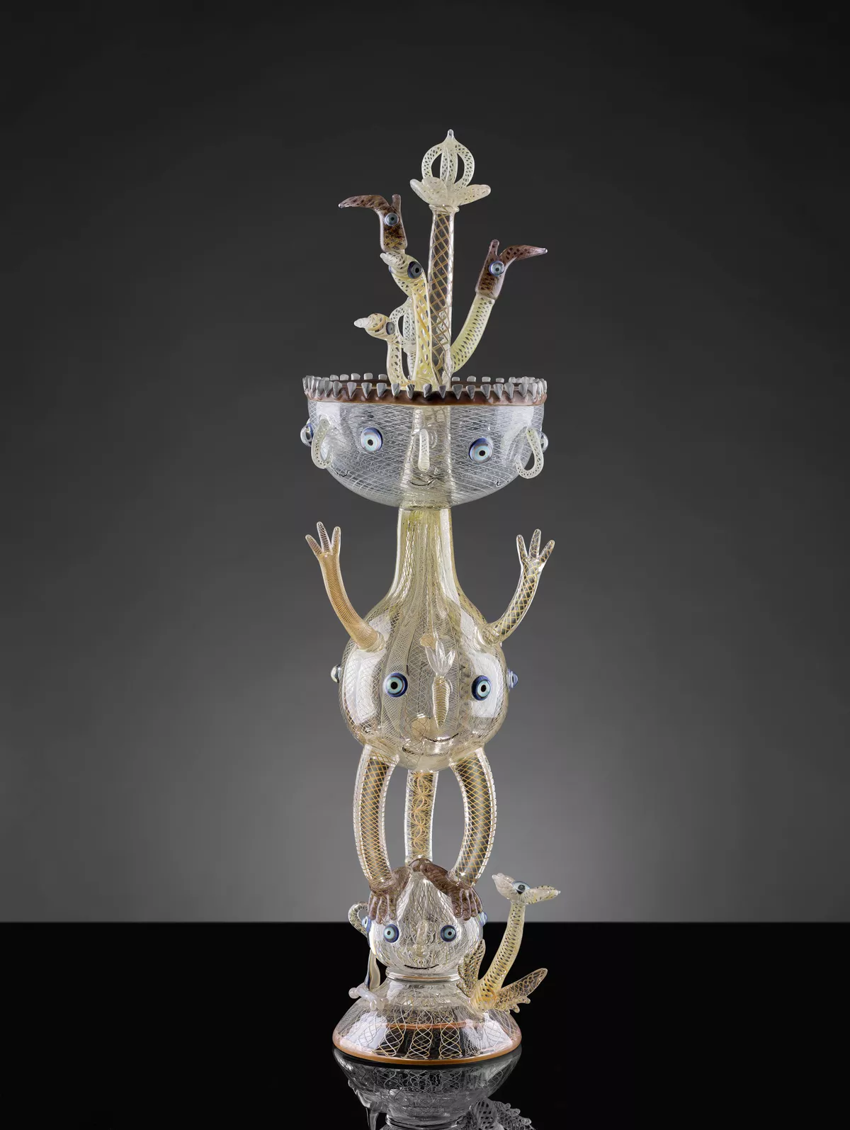 Lavish Gnashing expands upon the ancient traditions of elaborate, and sometimes comical, representational glass vessel production. Informed by his scholarship and consistent with his bestiary of playful vitreous figures, the central figure walks a fine line between eccentricity and technical rigour. In Moore’s words ‘it delights in the serious dedication that is necessary for making intricately patterned glass, together with an irreconcilable, off-kilter absurdity’.