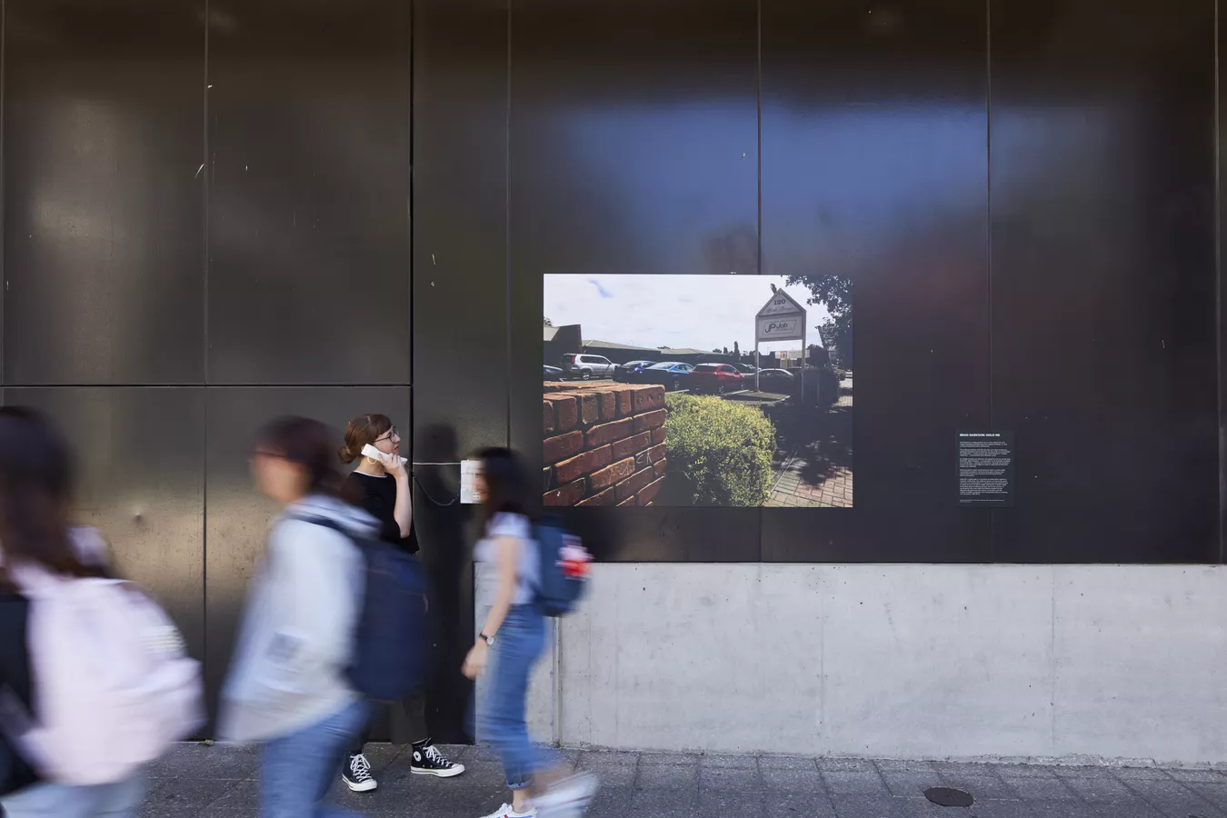 Hold Me (installation detail), 2020, Telstra Touchfone TF400, custom hacked telephone media player, dibond photographic print dimensions 2400 x 1200mm, audio duration 00.12.20sec. Photograph by Sam Noonan, courtesy Samstag Museum of Art