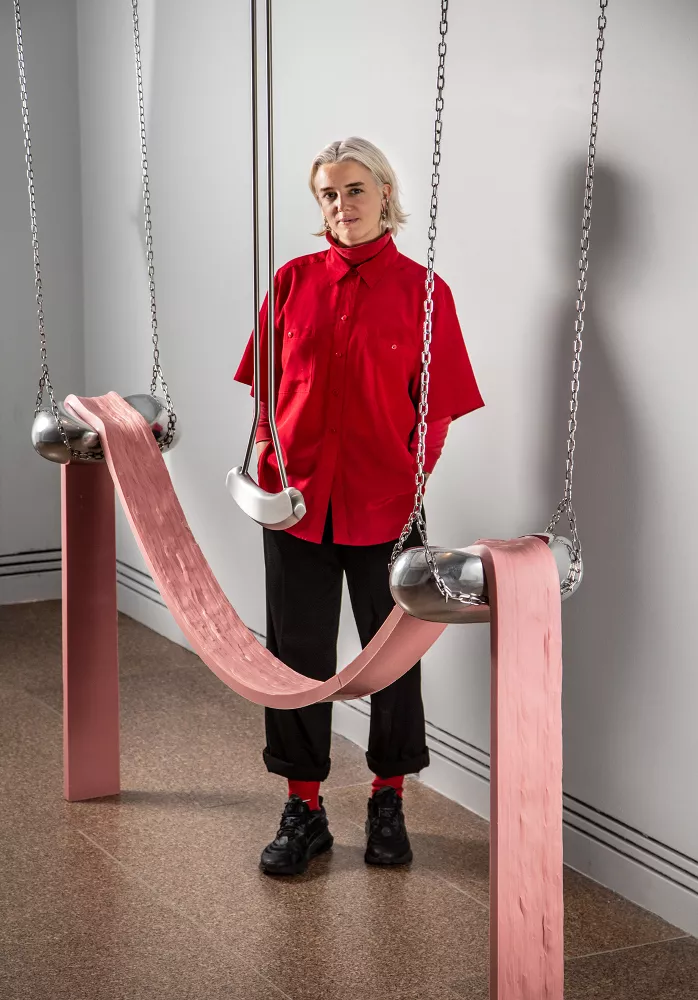 Gender stereotypes continue to be an area of interest for Bohunnis. In a recent in-conversation with Bohunnis and Erin Davidson, Project Officer at AGSA hosted by Station, Melbourne, Bohunnis discussed how she still found it surprising how she was often ignored or dismissed when purchasing materials for her work. In the 2021 exhibition fill me up and make me useful at Station, Melbourne, Bohunnis contrasts soft textiles with sharp steel.