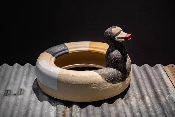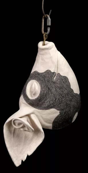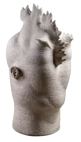 The unique properties of clay also give rise to Valenzuela’s distinct ceramic forms. Inanimate objects are hybridised or seen to amalgamate with human and animal body parts. A rubber duck morphs into a car tyre; a pig’s ear coddles a human ear; hooked fingers become horns, noses, beaks and tails. Clay often dictates the form of these shapeshifters. “Sometimes, clay moves by itself. It will tell you, it will guide you to go this way or that… Clay is alive.”[3]