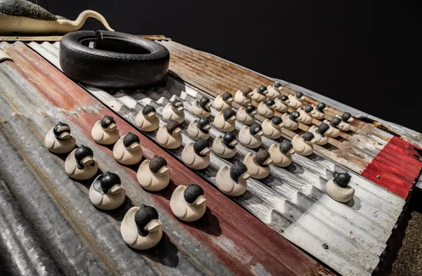 Although his practice wilfully resists categorisation, ceramics has come to be an enduring medium for Valenzuela. Over the past two decades, it has functioned as a linchpin to his wider installations – a practice combining elements of painting, drawing, sculpture, video, found objects, even street art. When using clay, Valenzuela says, “you make a friend and an enemy.”[1] It begins its life as a malleable, soft material which, once dried then fired at high temperatures, vitrifies into ceramic. This elemental alchemy – where fire transforms earth – makes it an ideal medium for Valenzuela, particularly in his explorations of control, conflict, fragility and resilience. “There are a lot of challenges in ceramics… it is part of the struggle. You encounter breakages, works crack, they can explode [in the kiln]; it is the perfect material for conflict.”[2]
