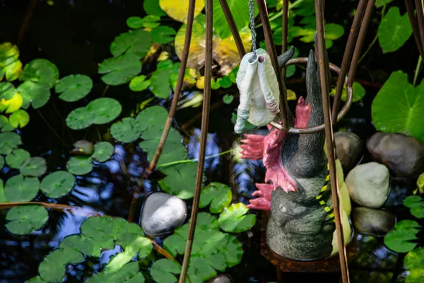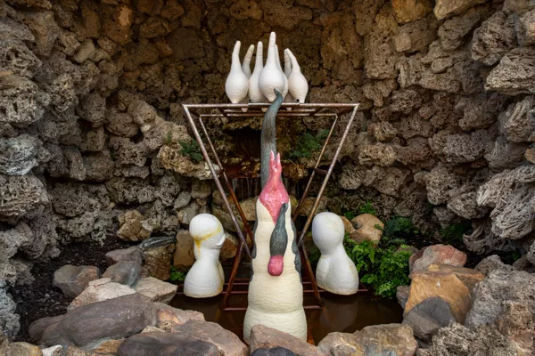 In Once Bitten, Twice Shy (2020), Valenzuela installed a steel armature in the Palm House at the Adelaide Botanic Gardens. The triangular structure was populated with ceramic hybrids and a rooster-like figure, posed as the tail of the bakunawa. For Valenzuela, the bakunawa is “a symbol of invasion… ever since, my country is a space subject to colonisation. There are always forces around it trying to invade or trying to take it from us.”[4]