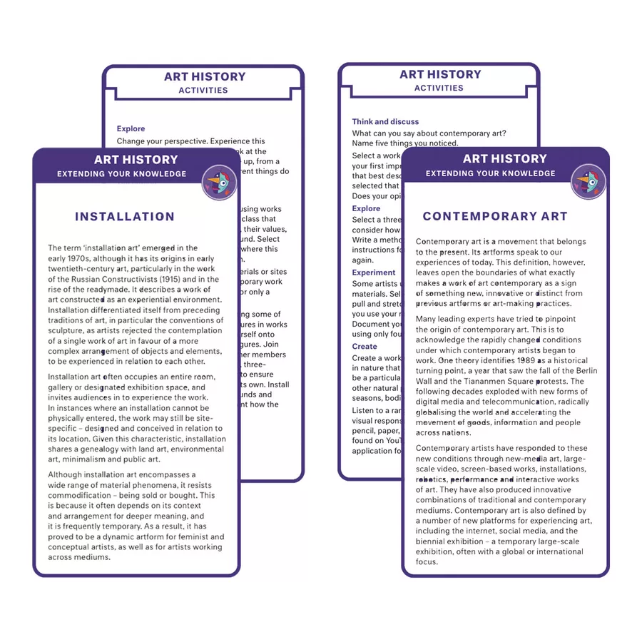 These words are used to describe works of art or the movements they belong to. These cards include definitions and activities and will extend your art history knowledge.