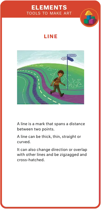 Definitions of line, colour, shape, form, texture, space and value, with corresponding activities. Elements are some of the visual tools artists use to make works of art.