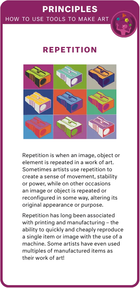 Definitions of balance, contrast, emphasis, harmony, pattern, proportion, scale, rhythm, movement and repetition, with corresponding activities. Principles underpin how an artist uses visual tools (elements) to make works of art.