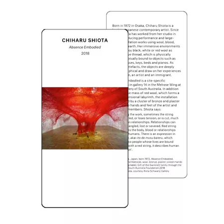 A card dealing with a single work of art can be paired with multiple elements, principles, terms, genre and or wild cards. This may mean that potentially you could have twenty activities to choose from, for just one work of art. Let's use Absence Embodied by Chiharu Shiota as an example. This work presents a great opportunity for students to learn about line, pattern, colour, contemporary art or installation. In addition, you could even throw in a wild card as an icebreaker to start the lesson.