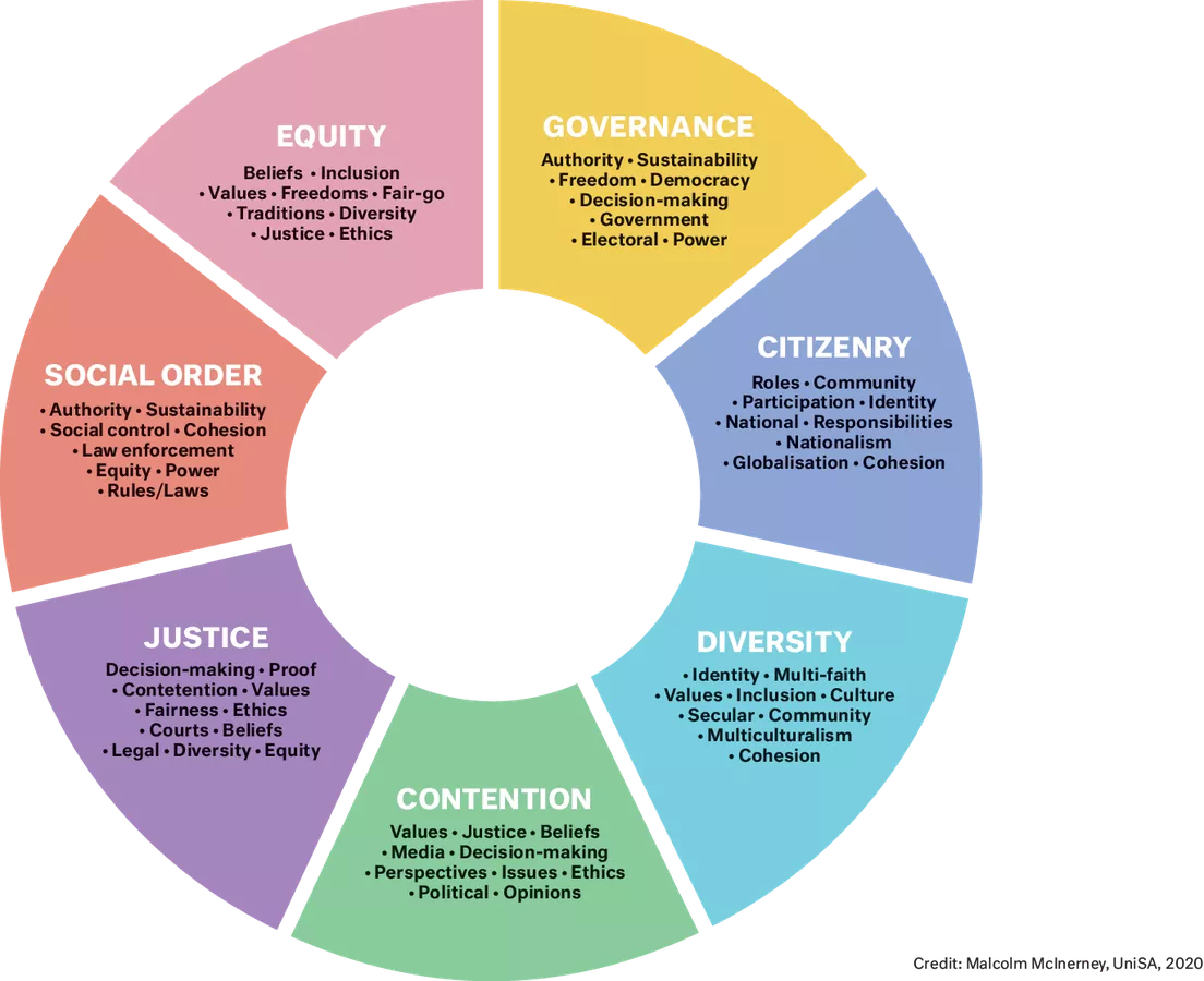 In creating this suite of resources, we have used the ‘Civics and Citizenship Concept Wheel’ created by Malcolm McInerney (Lecturer/ HaSS Curriculum Advisor at University of South Australia, 2020), as a way of connecting civics and citizenship concepts to works of art.