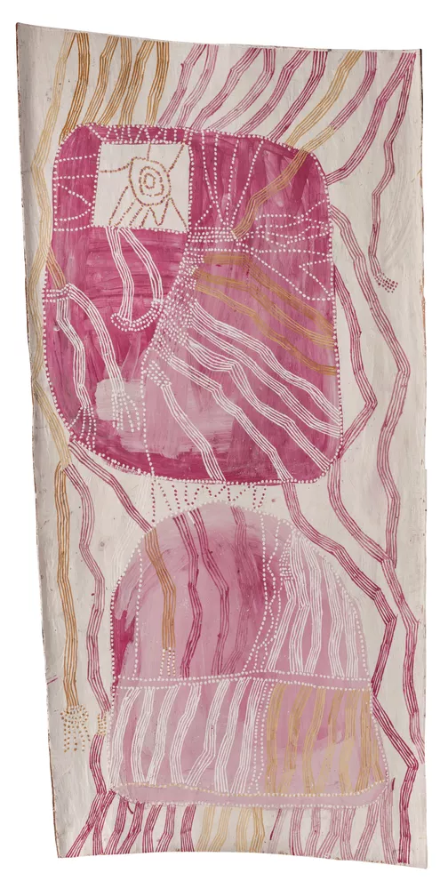 N Marawili, Madarrpa clan, Yolŋu people, Northern Territory, born Darrpirra, Northern Territory c.1938, died Yirrkala, Northern Territory 2023, Baratjala, 2019, Yirrkala, northeast Arnhem Land, Northern Territory, earth pigments, recycled print toner pigment on stringybark (Eucalyptus tetrodonta), 202.0 x 96.0 cm (work); Gift of Susan Armitage, Mary Choate, Jason Karas and Anna Baillie-Karas, Leo Mahar, Nicholas Sampson and Zena Winser through the Art Gallery of South Australia Foundation Collectors Club 2019, Art Gallery of South Australia, Adelaide, © N Marawili/Buku-Larrŋgay Mulka Centre.