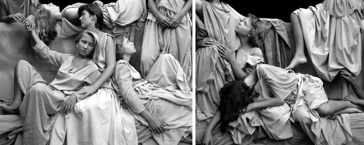 In her photographic tableaux, Australian artist Anne Ferran calls to mind the densely populated scenes found in ancient Greek temples. The greatest of these was the Parthenon, constructed on the hill of the Acropolis between 447-432 BC and dedicated to the goddess Athena. While the Parthenon’s pediments depicted stories relating to the gods and goddesses in the Greek pantheon, the temple’s 160-metre-long frieze illustrated a public procession that formed part of the Great Panathenaia, a festival honouring Athena. Ferran’s all-female cast includes the artist’s daughters and her daughter’s friends, all wearing classical dress and assuming the gestures and poses found in classical monuments.