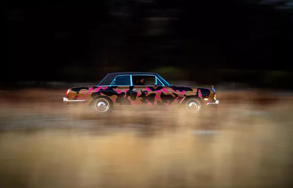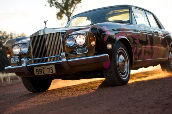 Rennie has painted the Rolls-Royce with a camouflage pattern in bright and bold colours. Traditionally, camouflage conceals or disguises animals or objects by using a combination of materials and colouration to optically confuse the observer. Rennie’s use of camouflage amplifies, rather than conceals, his identity. With his unique pattern, which is layered with a traditional diamond pattern of the Kamilaroi people, he has made the Rolls-Royce his own.