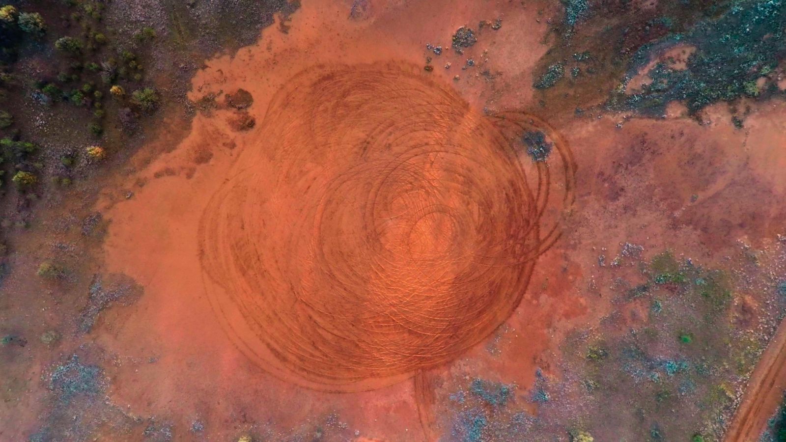 In OA_RR Rennie drives his Rolls-Royce through Kamilaroi Country to a site near where his grandmother was born. Rennie drives the car onto a clearing of land to make temporary marks into the red earth. This ephemeral act of mark making references large engravings created by the Kamilaroi people for ceremonies.