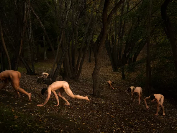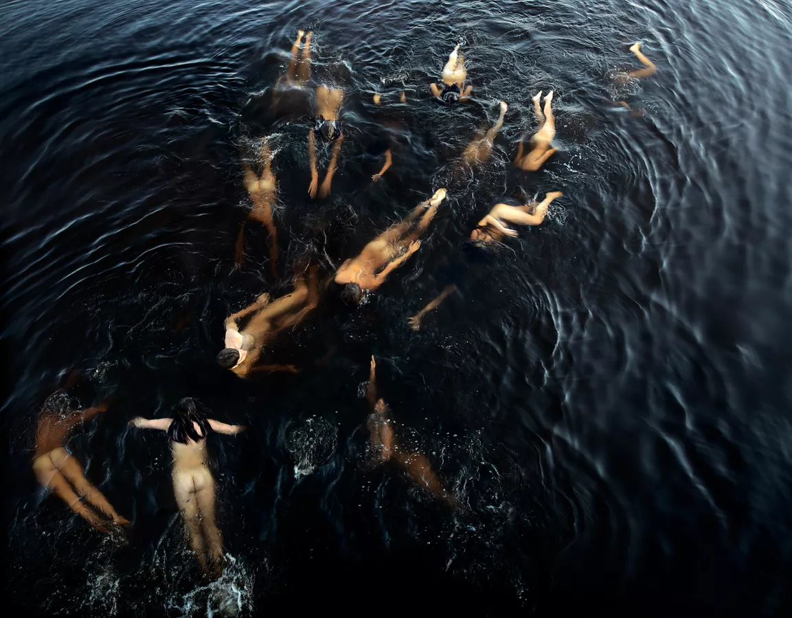 In Shoaling, from her 2015 series Instinctual, Dean photographed her nude models in the shallow waters around Byron Bay in northern New South Wales. The image depicts a constellation of partially submerged naked human bodies which mirrors the appearance of shoaling fish (a group of fish that swim closely together). The absence of clothing makes reference to human beings’ instinctive animal behaviour and connection to the natural environment. The tonal qualities of Dean’s photographic works and the intense contrast between light and dark, are reminiscent of her pre-Raphaelite inspirations which include John William Waterhouse. The pre-Raphaelites formed a society of rebellious artists in 1848 amidst scientific discovery and the Industrial Revolution in Britain. Inspired by early Renaissance works, these artists were dedicated to the study of nature and created paintings with photographic realism.