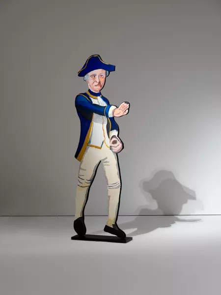 Close Contact is a double-sided work of art, which won the Ramsay Art Prize in 2019. Executed in acrylic paint on plywood, this three-dimensional work breaks away from the artist’s familiar single-sided rectangular formats to make a painting that the viewer can interact with in different ways. To make the work, Namatjira made preparatory drawings directly onto plywood, working from life in the case of the self-portrait on one side and from reference images, including E. Phillips Fox’s Landing of Captain Cook at Botany Bay, 1770, for the portrait of James Cook on the other side.