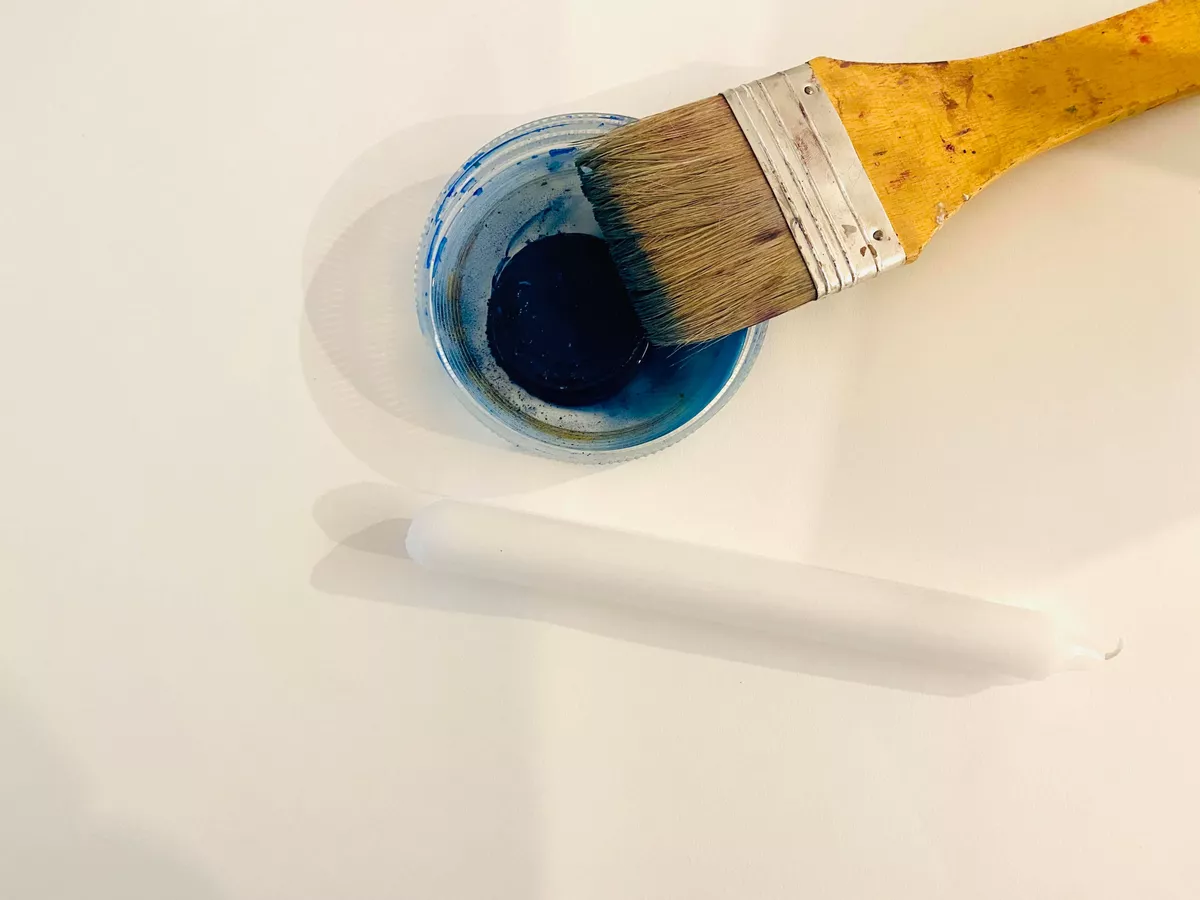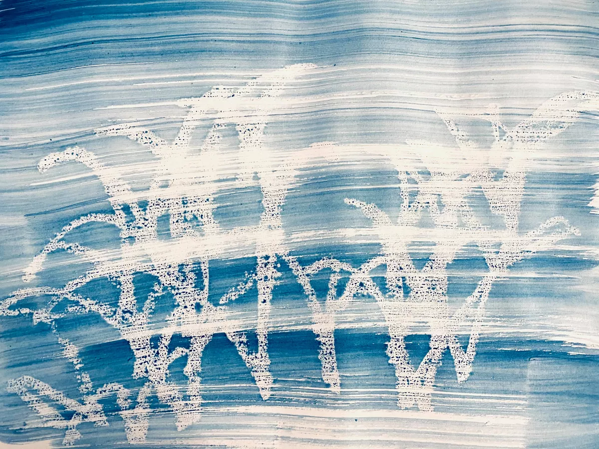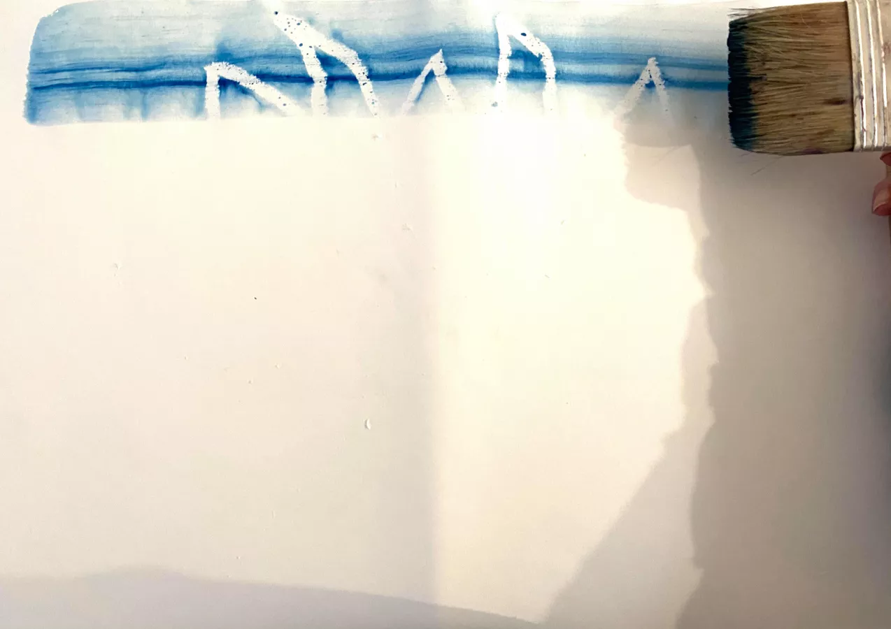 Reveal your drawing by painting over it with blue watercolour paint. Start at the top of your paper and work your way down. Only paint over the wax with one stroke - if you paint over the wax too much it will no longer resist the paint.
