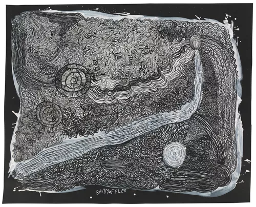 A blueprint is a reproduction of a technical drawing, often used in architecture and engineering industries. This process was introduced in 1842 and allowed for rapid and accurate reproduction of an image. Of course, today the blueprint is obsolete, replaced by computer design programs – but the images themselves are still beautiful to look at as a record of a particular place or building. Create a blueprint drawing of your own culture. Take a look below at how Tom Readett our Tarnanthi Education Officer responded to this activity. Tom has created a digital drawing but you could use white conte on blue paper.