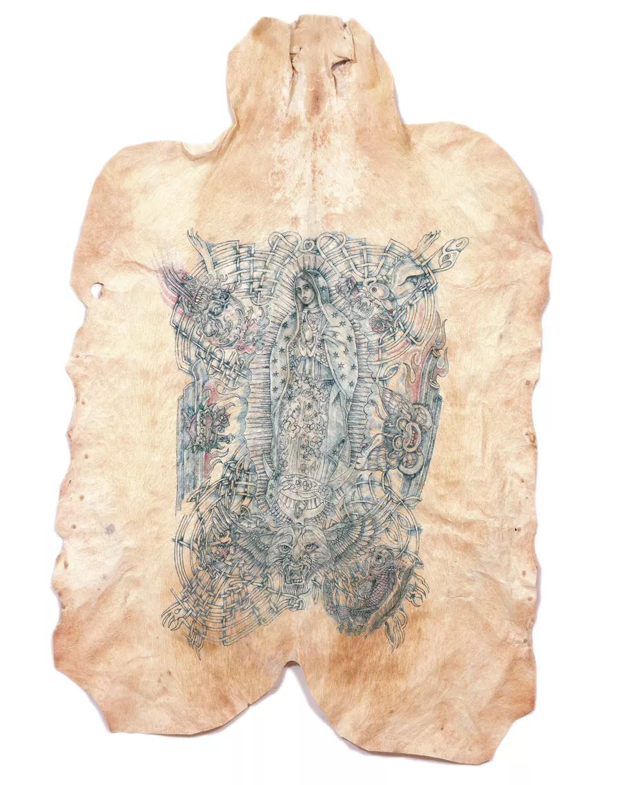 Wim Delvoye, born Wervik, Belgium 1965, Untitled (Robert), 2004, Beijing, tattooed pig skin, glass, frame, 190.0 x 138.0 cm; Roy and Marjory Edwards Bequest Fund 2011, Art Gallery of South Australia, Adelaide, © Studio Wim Delvoye.