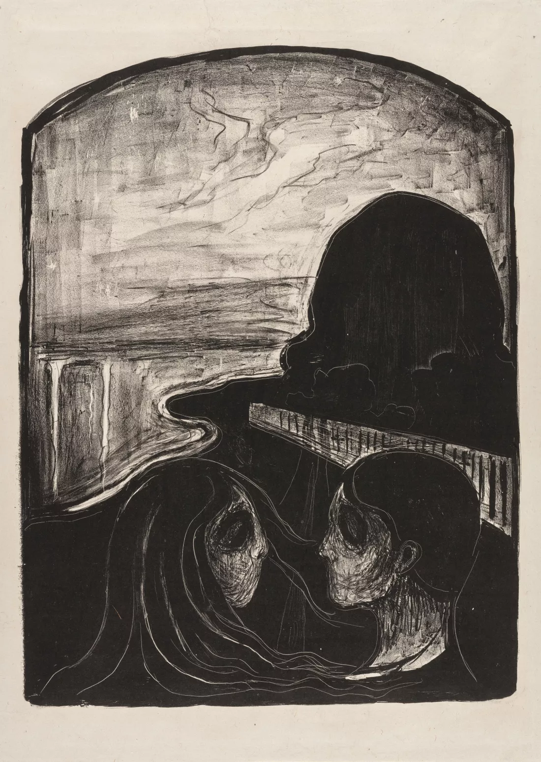 Known for creating The Scream, 1895, one of the most recognisable paintings of modernist angst, Munch was a painter–printmaker who created remarkably expressive works on paper that distilled and magnified themes of love, anxiety and death. Munch’s ability to communicate emotional states has continued to influence artists and writers including Melbourne-based artist, Brent Harris. Including key figures who influenced Harris's oeuvre, Attraction I is on display in the retrospective exhibition Brent Harris: Surrender & Catch (6 July – 20 October 2024).
