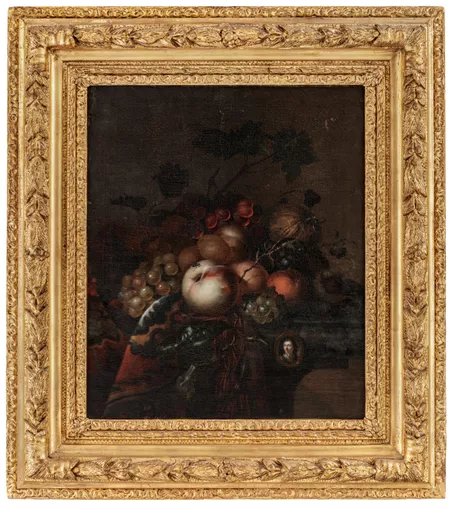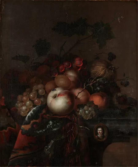 Still life with medallion demonstrates the ongoing importance of the still life genre, a tradition which came to the fore in the previous century during what is now known as the Golden Age of Dutch painting. Dutch still lifes are replete with important symbolism beyond merely representing beautiful objects and are often associated with the profound concepts of life, death and rebirth. An exotic concoction of red and white grapes, peaches, apricots, a gourd and chestnut, each of these objects has its own symbolic meaning, but more generally this work can be interpreted as a vanitas, a sombre reminder of both the beauty and fragility of everyday life.