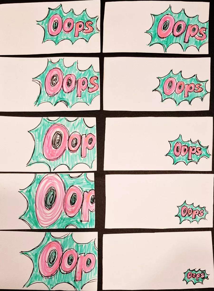 - On the next card, draw the same word again, but change it a little — make it bigger, smaller, tilted, or in a slightly different spot.
