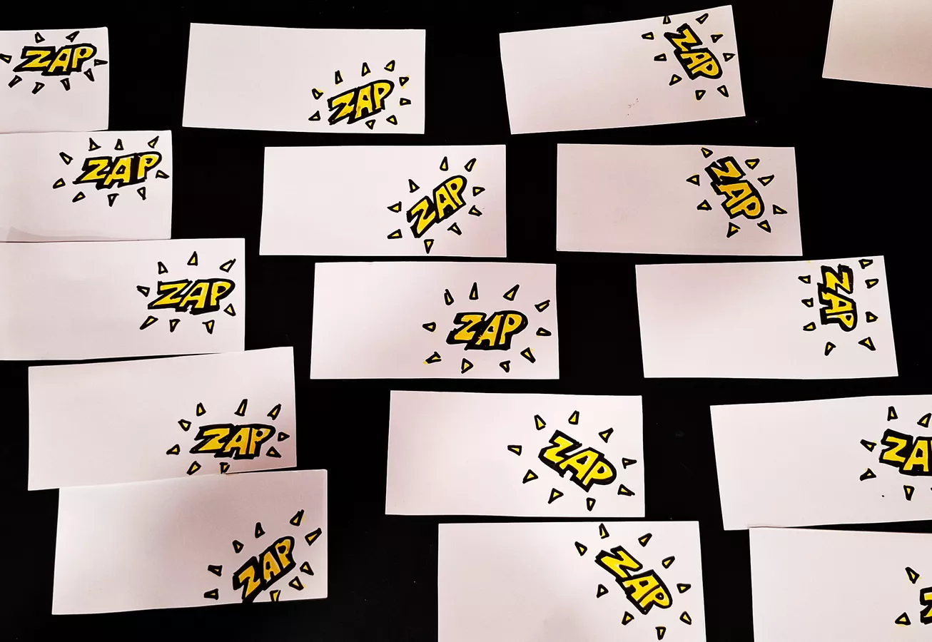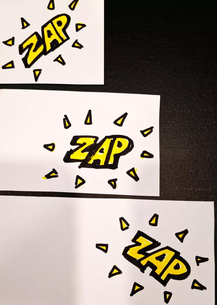 - Think of as many sound words (onomatopoeia) as you can — like BANG, POP, ZAP!